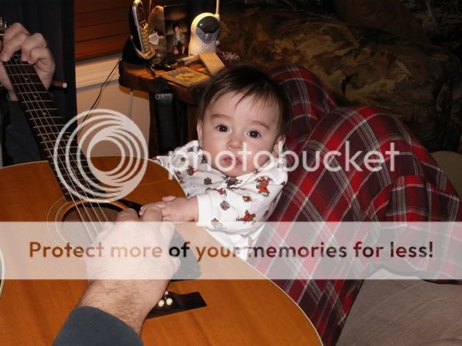 Last night, Gabe and his daddy were playing the guitar. We've always said we would start our child out early with an instrument. Of course, Daddy plays the guitar, and mama plays the bass so Baby Gabe needs to master a mandolin, or banjo, or fiddle or something. But I guess it's ok if he gets his start on the guitar. What floored me was the fact that Daddy actually let Gabe chew on his Gibson!! Watch out Daddy. You're being quite brave there!