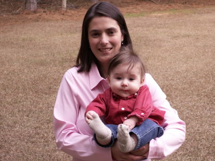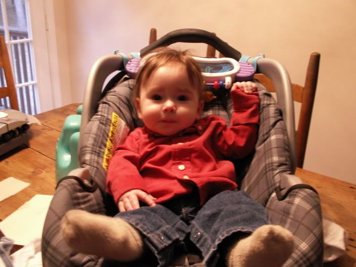 Gabe has his first ear infection. He has had a cough and stuffy nose for about 3 weeks now and earlier this months I took him to the doctor and they said his lungs were clear and his ears looked good and he was probably getting over it. Well, he didn't. This weekend the cough was still going strong and he started running a fever on Sunday night, so Monday I took him in and sure enough, he has an ear infection. He ran a fever all day yesterday and still had one this morning. He is not real interested in eating because it hurts him to suck on his bottle but he is doing pretty good with drinking out of his bottle like a cup. He is on an antibiotic and motrin for the fever. Please send him some get well prayers.