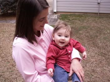 Daddy finally looked at The Land of Gabe the other night and commented on how there were no pictures of me. Well, that one's simple, there really aren't that many pictures of me because I am the photographer at our house. So on Valentine's Day, it was farily warm when we got home that afternoon, and Daddy was outside with the girls so I took the camera out there for a photo op of me and Gabe. Here is what happened...